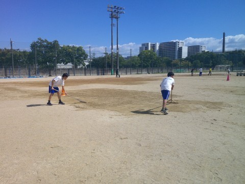 昨日の雨で,午前中は運動場が使用できませんでした。昼休みに2年生の学年練習のために,野球部と先生たちでグランド整備をしてくれました。ありがとうございました。