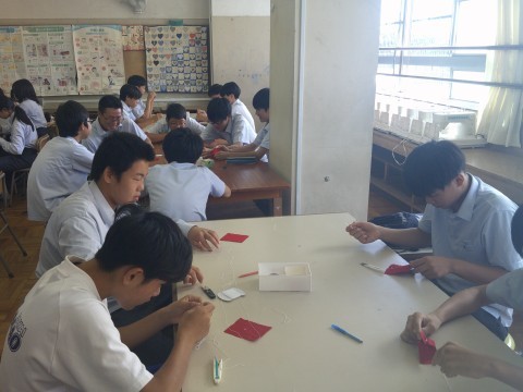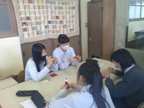 被服室で,裁縫の授業が始まりました。今日は,玉結びをしていました。小学校でも習っていたので,上手にできていました。国語の授業では,学習した物語の続きを創作していました。タブレットで共有していました。