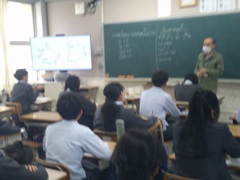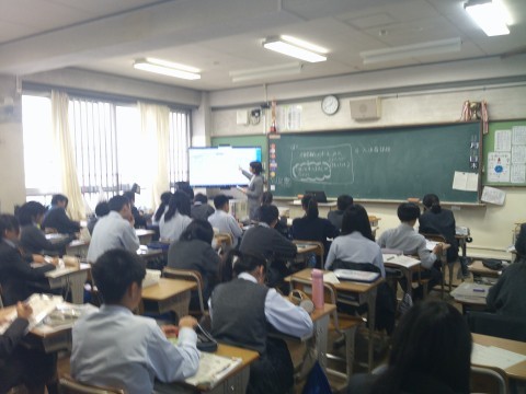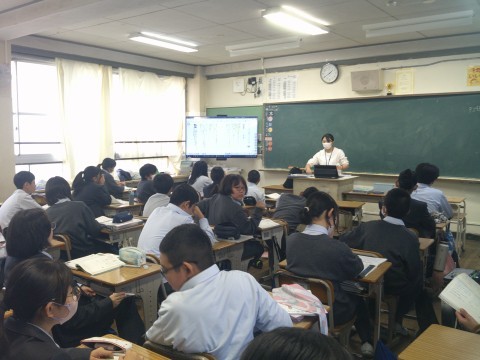 英語の授業は,研究授業を行っていました。動詞のーingの形を用いた後置修飾の学習でした。市教委から専門指導員の石川先生に来ていただき指導と助言を受けました。社会科では,地方自治体について考えていました。都市によって,起こりやすい災害を考えると地方自治体の役割の重要性がわかってきます。数学は,平行線と線分の日についての学習でした。