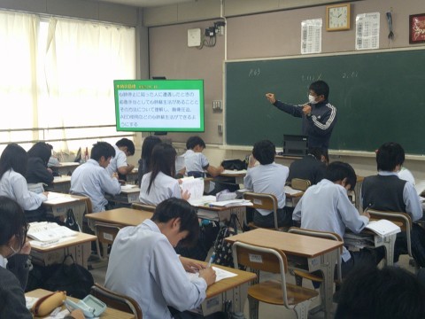数学は,合同条件の学習。体育は,胸骨圧迫やAEDの使い方についての学習。理科の授業は,水の電気分解や酸化銀の熱分解の化学式について学習しています。1・2組が学級閉鎖になりましたが,3クラスは,頑張って勉強しています。