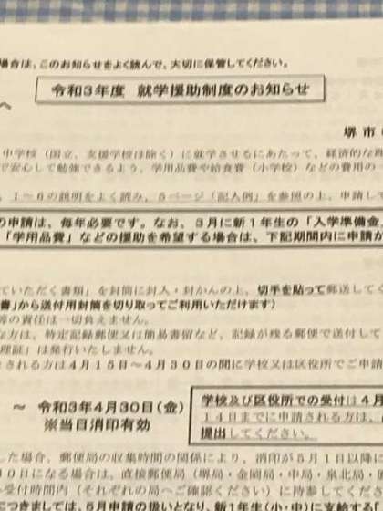 堺市では、経済的な理由により就学困難なご家庭にお子さんが学校で安心して勉強できるよう、学用品などの費用の一部を援助する制度をもうけています。本日お知らせを配布しました。