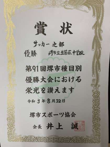 昨日行われた堺市種目別優勝大会において,本校サッカー部が見事優勝しました。 おめでうございます。