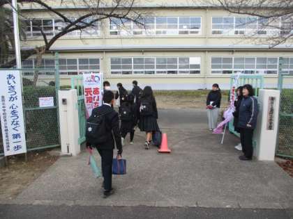 きょうは、今シーズン最強の寒気が流れ込み、強い冬型の気圧配置になるようです。寒さに負けず、学級代表さんがあいさつ運動をしてくれています。↓登校の様子です。