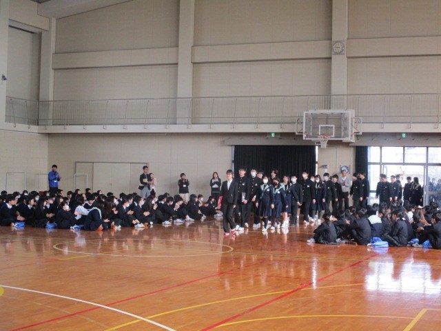 本日1限、3年生を送る会を行いました。全校生徒が一堂に会する最後の場です。在校生より盛大な拍手を送られながら、3年生が入場してきました。