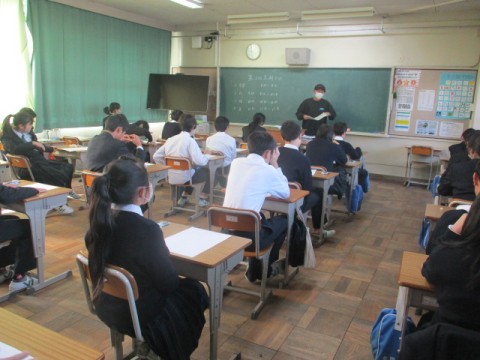 写真は、2年生のテスト開始前の様子です。これから3日間続くテストを前に、少し緊張した様子の生徒が多いかな…。