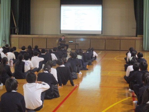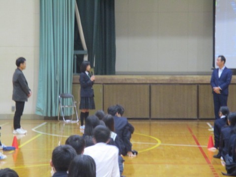 12/2(火)6限2年生は、外部から講師をお招きし、職業講話を実施しました。講師の先生のこれまでの経験をふまえながら、「仕事」についてのお話をしていただきました。将来の仕事の選択肢の幅を広げておくためにも、中学校で今学んでいるいろんな教科に前向きに取り組むといいと思うとの励ましもありました。講演の最後には「将来の夢や今後こんなことをやりたいなと思うことをちょっと考えてみてください。そして今、学んでいる教科の授業が、その夢や希望にどうつながっているか考えてみてください。」との問いかけがありました。今学んでいる各教科の学習が、将来のみなさんにどうつながっていくのか、ちょっと想像してみると前向きに頑張れることが増えるかもしれませんね。代表生徒からお礼の挨拶がありましたが、講演を聴いたみなさん一人ひとりがお礼の気持ちをこめて、最後の問いかけについて考えてみてください。