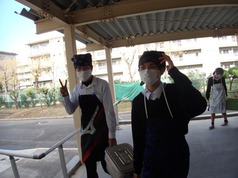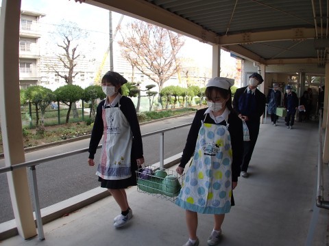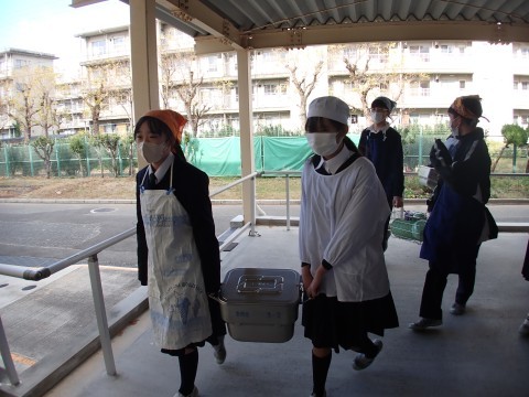 給食当番が配膳室から教室に食缶を持っていく様子です。