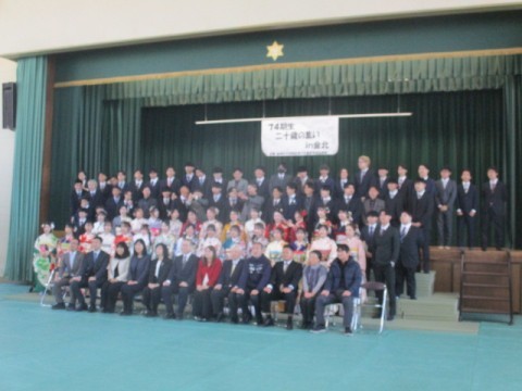 本日、金岡北中学校区青少年健全育成協議会主催で『二十歳の集いin金北』を開催いたしました。81名の皆さんが集い、その保護者の方や青少年健全育成協議会役員・地域の実行委員の方々にも参加していただき、盛大に会を開催することができました。