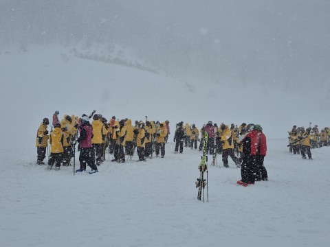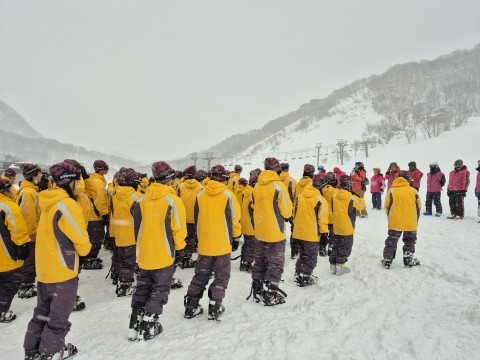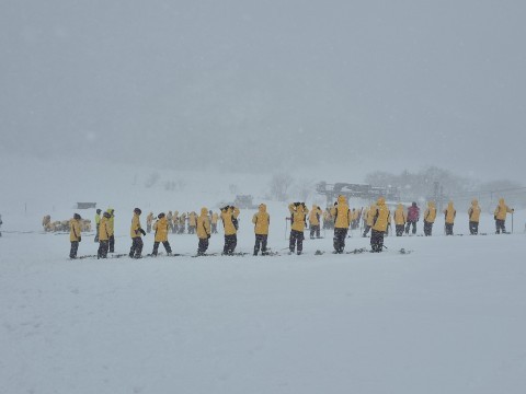 集合写真を撮り終えた後、少し吹雪出しました。風が冷たいです。そんな中、スキー講習が始まりました。「行ってきます!」と元気に言っている生徒も何人もいました。頑張ってください!