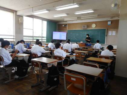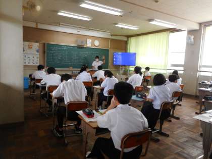 5限めの1年生の英語の授業では、今年度はじめて、1クラスを2つに分けて、少人数授業を実施しました。それぞれのクラスで「be動詞」の学習をしました。