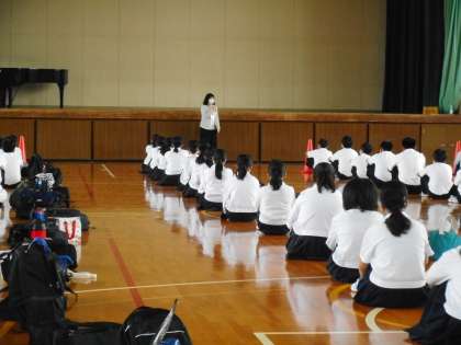 本日終礼後、体育館で入部式を行いました。今年度は密を避けるため、体育館には1年生全員と、各部活動のキャプテンが集合し、2・3年生の部員は各部活動の教室で待機し、新入部員の合流を待ちました。