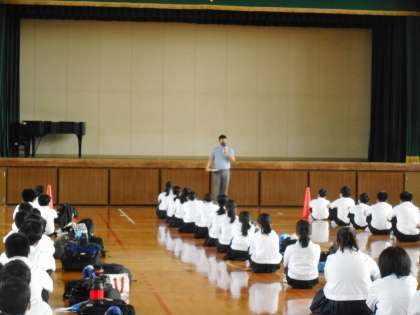 最初に校長先生から1年生に、「打ち込めることの一つに部活動をぜひ頑張ってほしい、部活動と勉強をしっかり両立して頑張ってほしい、顧問の先生にも、いつでも相談してください」と話があり、「部活動の良さは各学年で役割を持ち、1つの目標に向かって取り組み、みんなで喜ぶことができることです」と、部活動のすばらしさも話されました。
