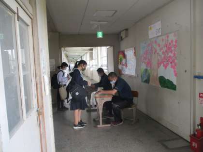 登校後はすぐに各学年フロアで健康確認です。 ↓1年生の様子です。