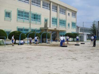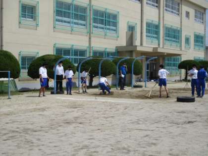 2年生2・3組の男子体育です。走り幅跳びをしました。助走距離・助走スピード・踏切・空中動作の中で自分で目標を立てながら跳ぶことができました。