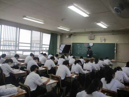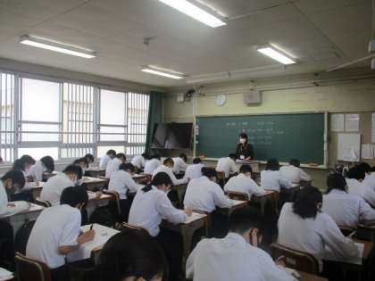 2年生の英語のテストの様子です。リスニングテストも実施しました。本日は英語・理科・社会のテストです。頑張りましょう。