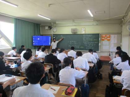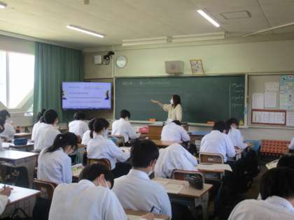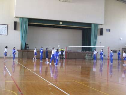 3年生の授業の様子です。英語の授業では、留守番電話のメッセージを題材にして学習しました。理科の授業では、原子が電子を受け取ったり、失ったりしてイオンになることを、原子のモデルを書きながら考えていきました。女子の体育は、バレーボールを試合形式で行い、ローテーションについても学びました。