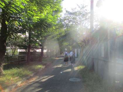 本校通用門側の遊歩道は、朝の登校時間も多くの地域の方が通られます。生徒の登校時に道幅全体を使って歩いていたことから、道の中央にプレートを置き、校舎側を歩くようにしました。プレートがなくても意識できるようになっていますが、まだまだ完全ではないのでプレートを置いています。きょうも、「これは何のために置いているんですか」と地域の方からご質問があり、経緯をご説明しました。プレートがなくても自分たちだけの道ではないことが意識できるよう今後も生徒に伝えていきます。