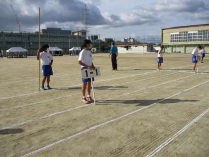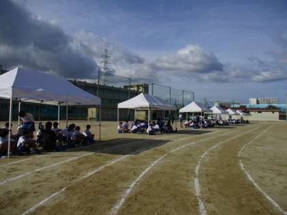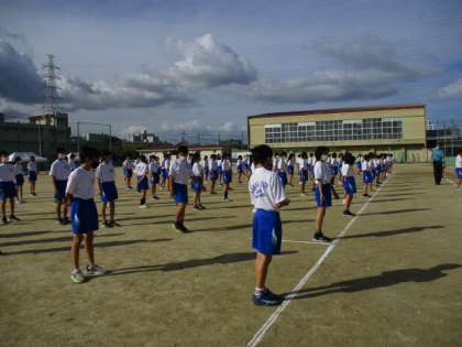 きょうは、学年別体育大会の予行でした。1・2限は1年生です。ドキドキ緊張しながら、先生の話をしっかり聞いて行動できました。開会式の様子です。