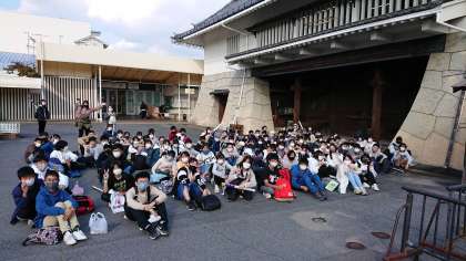 1年生校外学習は班別行動が終了し、太秦映画村の中央広場に集合完了しました。これからバスに乗り学校に戻ります。