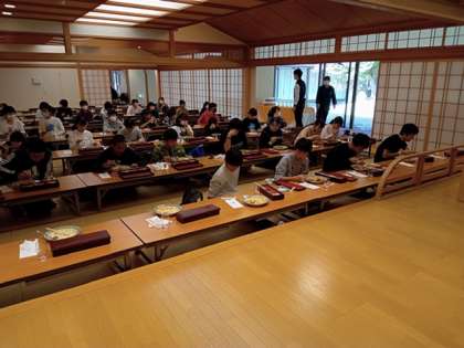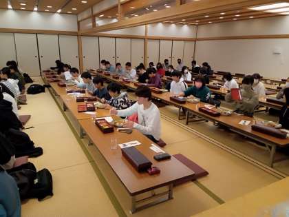 体験をちょっとひと休みして、班ごとで昼食会場に集まってきました。いろいろごちそうがあって、カレーライスもあります。