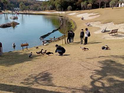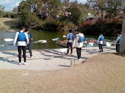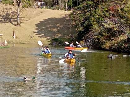 カヌー体験に何人か来ました。まずは、パドルの使い方を聞いてから体験に入りました。水辺では鳥と遊んでいる人もいました。ぽかぽか陽気で気持ち良さそうですね。