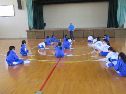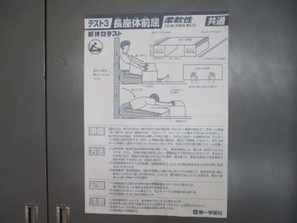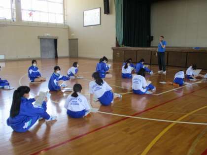 女子は、『長座体前屈』を測定しました。測定後は、来年の2年生の測定時までの1年間でどんなことを取り組んだらいいのかを考えてノートに記入しました。何人かは「柔軟体操を意識します」と話してくれました。