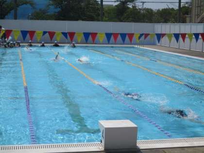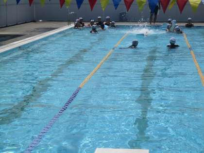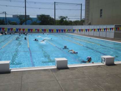 午後の授業です。プールで水泳の実技の授業です。クロールで泳ぐ練習をするグループと、まずはビート板を使って泳ぐグループとに分かれています。みんな頑張って練習しています。