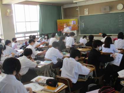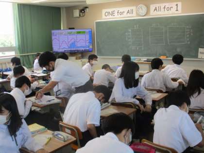 きょうの英語の授業はネイティブスピーカーのダーウィン先生にに来ていただいています。「あなたは何が〜ですか(好きですか)?」と様々な質問をされ、答える練習をしています。社会の授業では、雨と気温を図に表す練習をしています。いろんな地域を比べ、その地域の特色を学んでいます。