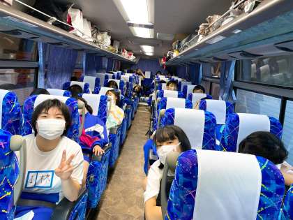 あと20分で宿舎に到着予定です!バス内は疲れて寝ている人も多いです。