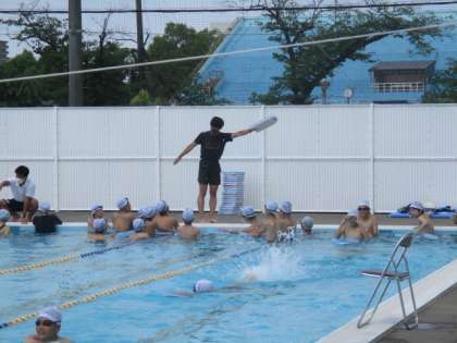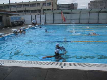 きょうは、教育実習生による研究授業を行いました。クロールの腕の回し方を身に付けることを目標に練習しました。どのグループの生徒も教えてもらったポイントを押さえて泳いでいます。