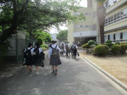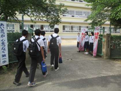 生徒会の「あいさつ運動」がきょうからスタートしました。きょうは、生徒会役員の3人が登校してくるみんなに一人ずつ声掛けしてくれました。