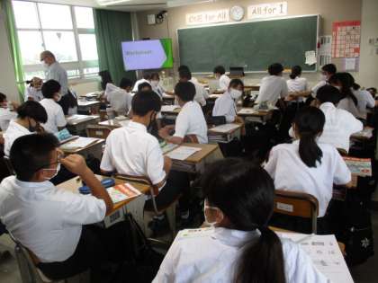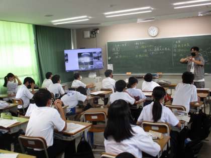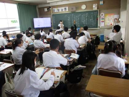 1組は英語の授業です。生徒のみんなが自分で書いた英文をネイティブスピーカーの先生に話しています。2組は理科の授業で、気体の性質について学んでいます。3組は国語の授業で、登場人物の心情に注目して読んでいます。