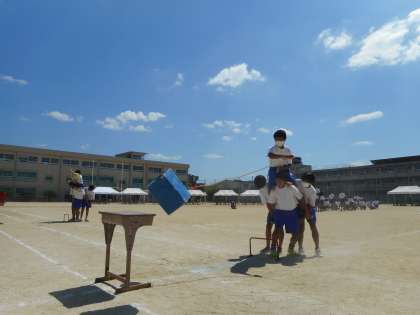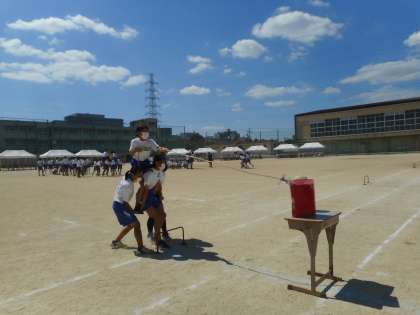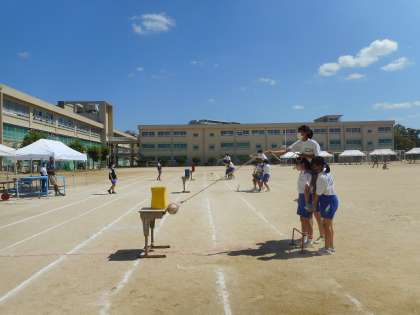 2年生の学年種目はローハイドです。みんな上手にボールを缶に当てて落としています。