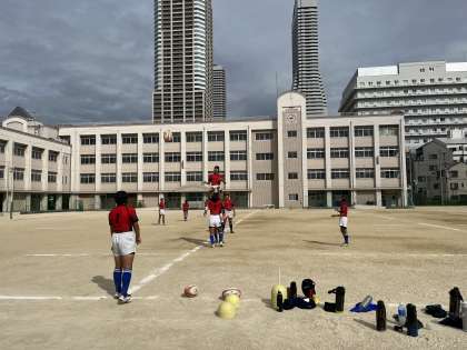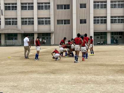 本日、大阪市立市岡中学校で行われたラグビー部の公式戦の様子です。試合が始まります。目標「最後まで楽しんでやろう!」と顧問の先生からの言葉でみんな声を掛け合いました。