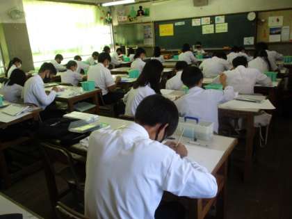 1組は美術の授業で、和紙のランプシェードのデザインをしています。和紙の特性を考え、見え方を考えながら作成しています。2組は社会の授業で、プライバシーの権利などの新しい人権について学んでいます。3組は音楽で、パートに分かれて合唱の練習をしています。