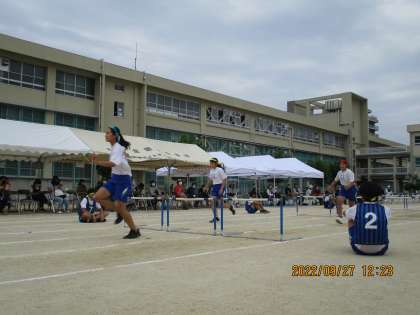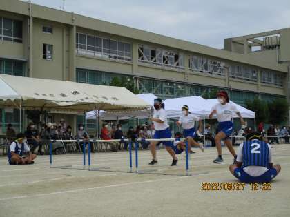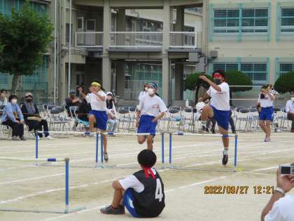 午前の部ラストの種目です。1年生から3年生の女子のレースがスタートしました。たくさんのハードルを越えてゴールをめざしました。