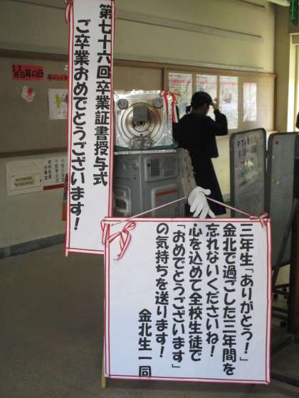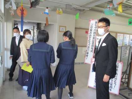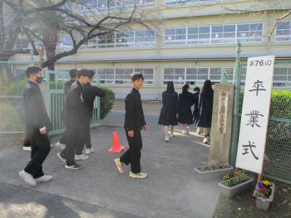 暖かい日差しの中、76期生の卒業証書授与式が行われます。卒業生が朝早くから緊張した面持ちで登校しています。