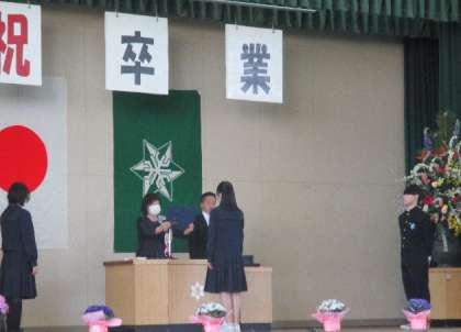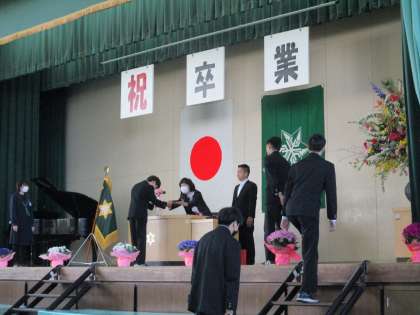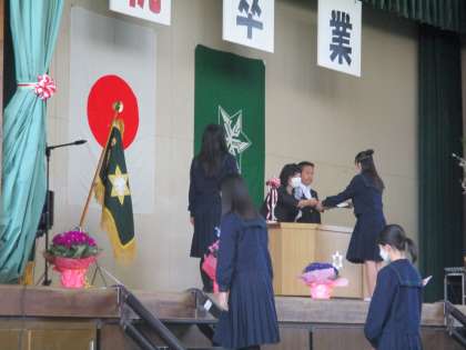 卒業証書授与の様子です。担任の呼名に最高の返事をして、校長先生から卒業証書を受け取ります。