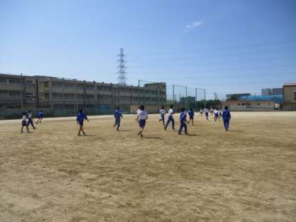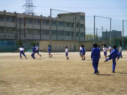 1年生の男子体育の球技「ゴール型」サッカーの様子です。きょうはゲーム形式です。一人ひとりがボールの動きに対してよく動けています。指示の声も出て、みんなでゴールをめざしている様子がよくわかりました。