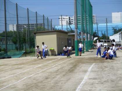3年生では、新体力テストの終盤となりました。きょうは、50m走の計測を行いました。20mと50mにコーンを置いて、その先にもコーンを置いて、最後まで走りきるという練習を行いました。前傾姿勢からのスタートも意識していました。