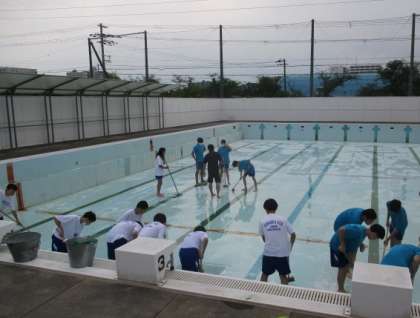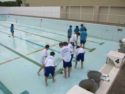 放課後に、プール掃除を行いました。水泳部を中心に、ラグビー部からも数人お手伝いにきてくれました。昼間は高い気温でしたが、放課後には、肌寒く感じる中、きれいにしてくれました。