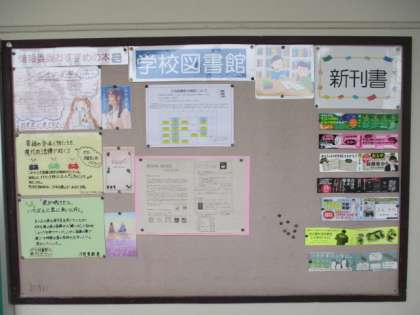 職員室前の掲示板です。図書室の本の貸し出しについての情報を掲載しています。