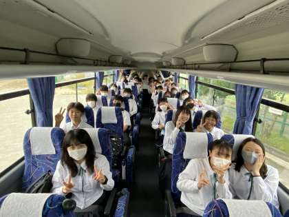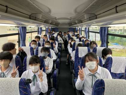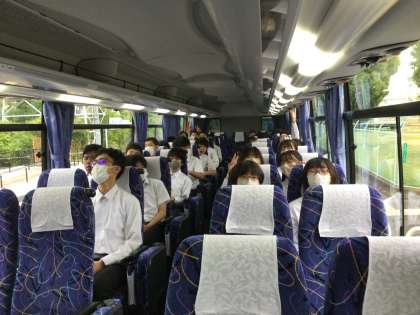 バスが学校を出発しました。学校の南門を出発する際、近隣を走行中の皆様、ご協力ありがとうございました。バス内は先ほどの緊張感から一転して「楽しみ」一色です。