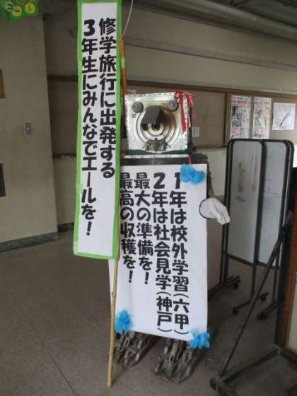 いよいよ、3年生が5/29〜31まで修学旅行(中国・四国・淡路島方面)に行ってきます。1・2年生も3年生にエールを送ってあげてください。また、1年生は5/29に六甲山へ校外学習、2年生は5/30に神戸方面に社会見学に行きます。