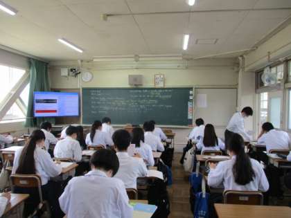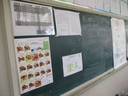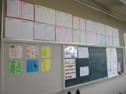 本校では、学力向上の取組の一つとして、『金北スタンダード』を決めて、全クラスで実践しています。教室の前の壁には、『日課表などの最小限のものしか貼らない』『クラスの作品や周知事項は後ろに貼る』『宿題等の連絡は後ろの黒板に書く』ということを挙げています。