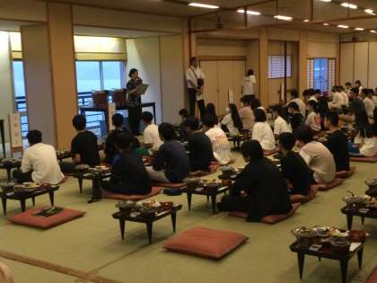 ホテルに到着し、着替えて入館式を行いました。実行委員の司会で、実行委員の挨拶の後、宿舎の方からご挨拶をいただきました。