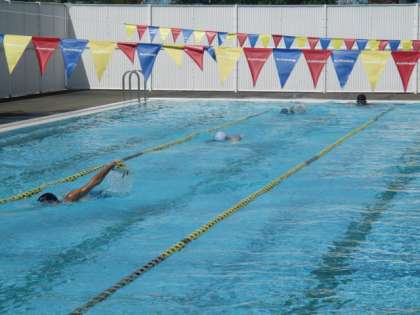 筋力トレーニングのために、道具を使って泳いだり、タイムトライアルをしたり、みんな頑張っています。