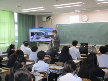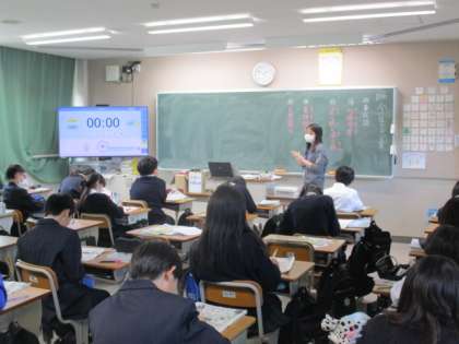 理科の授業では、「大地の成り立ちと変化」について、地層のでき方を学習しました。小学校で習った風化や浸食などを振り返りながら、地層を作るための働きを学習しました。国語の授業では、「今に生きる言葉」を題材に、「故事成語」について、漢字や意味を学習しました。とくに間違えることが多い漢字のポイントを聞いて、みんなで共感しました。