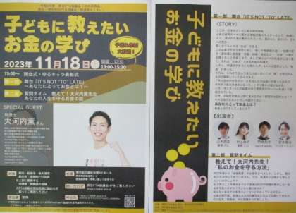 昨日、11月18日(土)に、堺市PTA協議会「中央研修会」泉北・堺市地区PTA協議会「指導者セミナー」に参加させていただきました。開会式とゆるキャラ表彰式に始まり、第一部の舞台や、第二部では、講師の先生と参加しているみなさまと、素朴な疑問や家庭でのお金の教育などについてディスカッションが行われました。ご多用の中、ご出席いただきましたPTAの皆様、ありがとうございました。