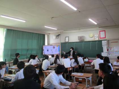 本日3年生の英語は、NSの先生も入って授業が進められていました。クイズ形式で関係代名詞等の復習もしながら、英会話の実践がおこなわれていました。時おり笑い声も聞こえる楽しい授業展開でした。